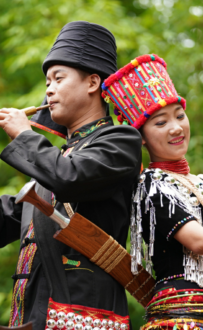 拉祜族人口約41萬(wàn),主要聚居在思茅、臨滄境內(nèi)的瀾滄江沿岸地區(qū)。拉祜族寨與基諾族寨緊緊毗連,寨內(nèi)建有拉祜族茅草房、大公房、教堂、牛棚以及葫蘆廣場(chǎng)。位于拉祜族寨中心位置的葫蘆廣場(chǎng)形似一只碩大的葫蘆平面,核心有一組石雕葫蘆。傳說拉祜族的祖先誕生于葫蘆中,因此葫蘆廣場(chǎng)表現(xiàn)了拉祜族的祖先崇拜觀念。漫步拉祜族寨,葫蘆笙悠揚(yáng)婉轉(zhuǎn)、口弦聲余音繞梁,表現(xiàn)拉祜族勞動(dòng)場(chǎng)面的“豐收擺舞”充滿歡騰和激情,展示了拉祜族的民間...