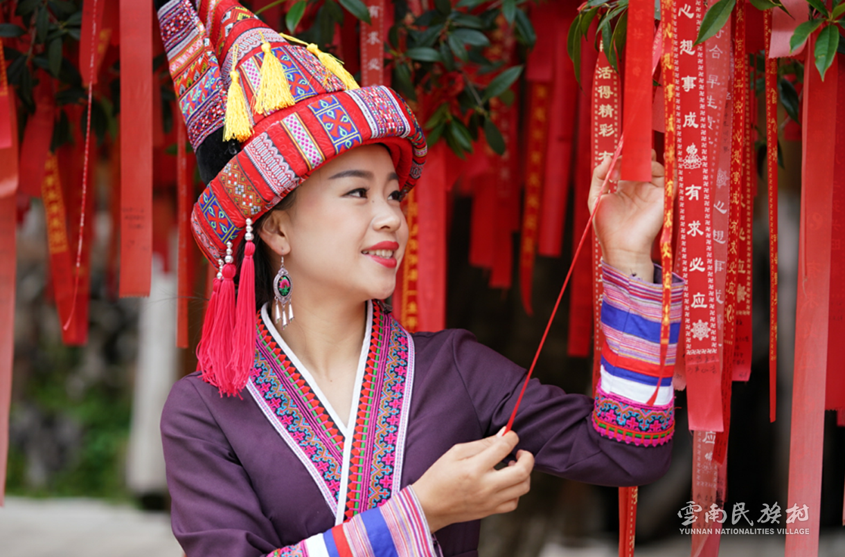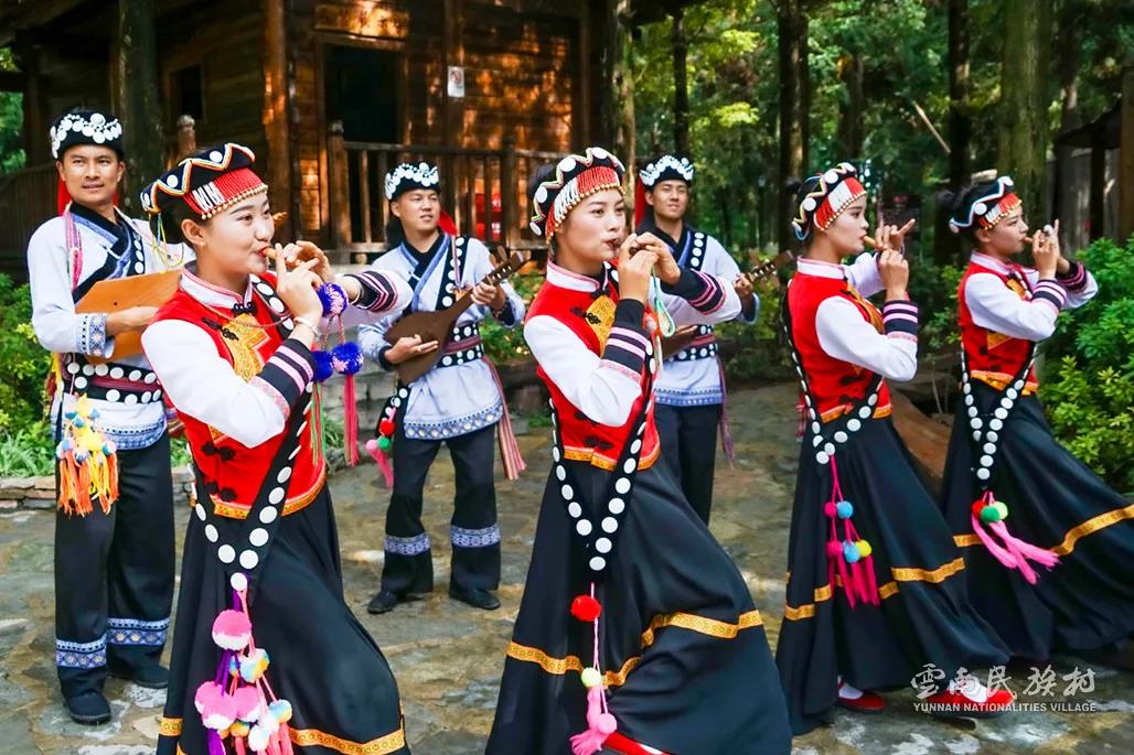 彝族在云南境內(nèi)約471萬(wàn)人,是省內(nèi)人口最多、分布最廣的少數(shù)民族,主要聚居在金沙江、元江流域和哀牢山、無(wú)量山腹地。彝族是一個(gè)能歌善舞的民族,民間打歌、跳樂之風(fēng)盛行,大三弦、跌腳舞久負(fù)盛名。火把節(jié)是彝族最具特色的民族節(jié)日。彝族村占地50余畝,三虎浮雕墻與虎頭內(nèi)祖師形象表現(xiàn)了彝族虎鷹文化。太陽(yáng)歷廣場(chǎng)圖騰柱上有太陽(yáng)、虎、火和八卦圖形象,周圍環(huán)繞著10個(gè)朝向不同的月球造型,外圓周有12生肖石雕。依山而建的“...
